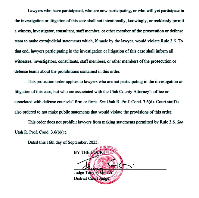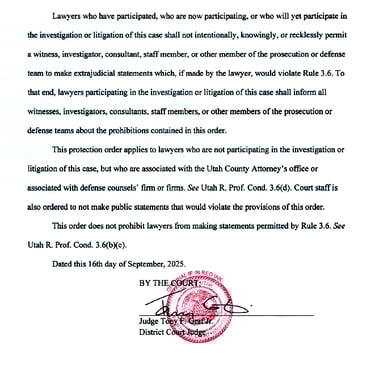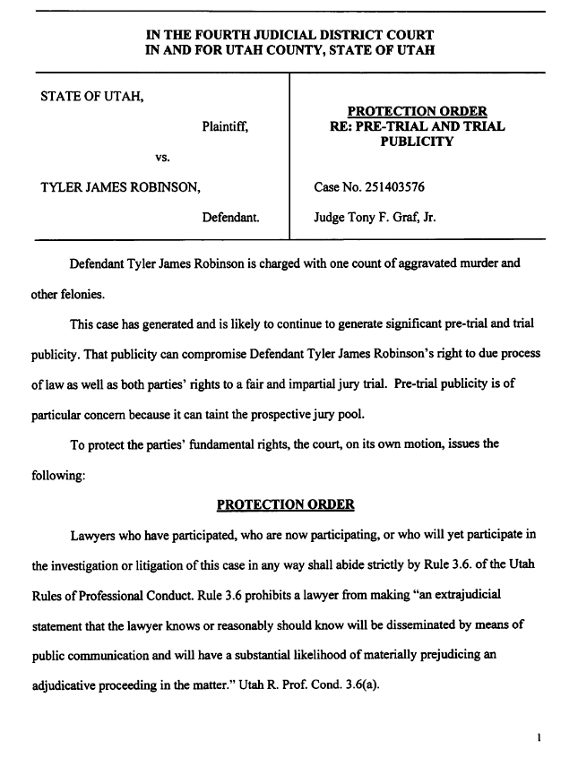 If anyone is interested in purchasing the gag order from the Utah Court case system you can do that for ten bucks. Case #251403576 State of Utah v. Tyler Robinson
